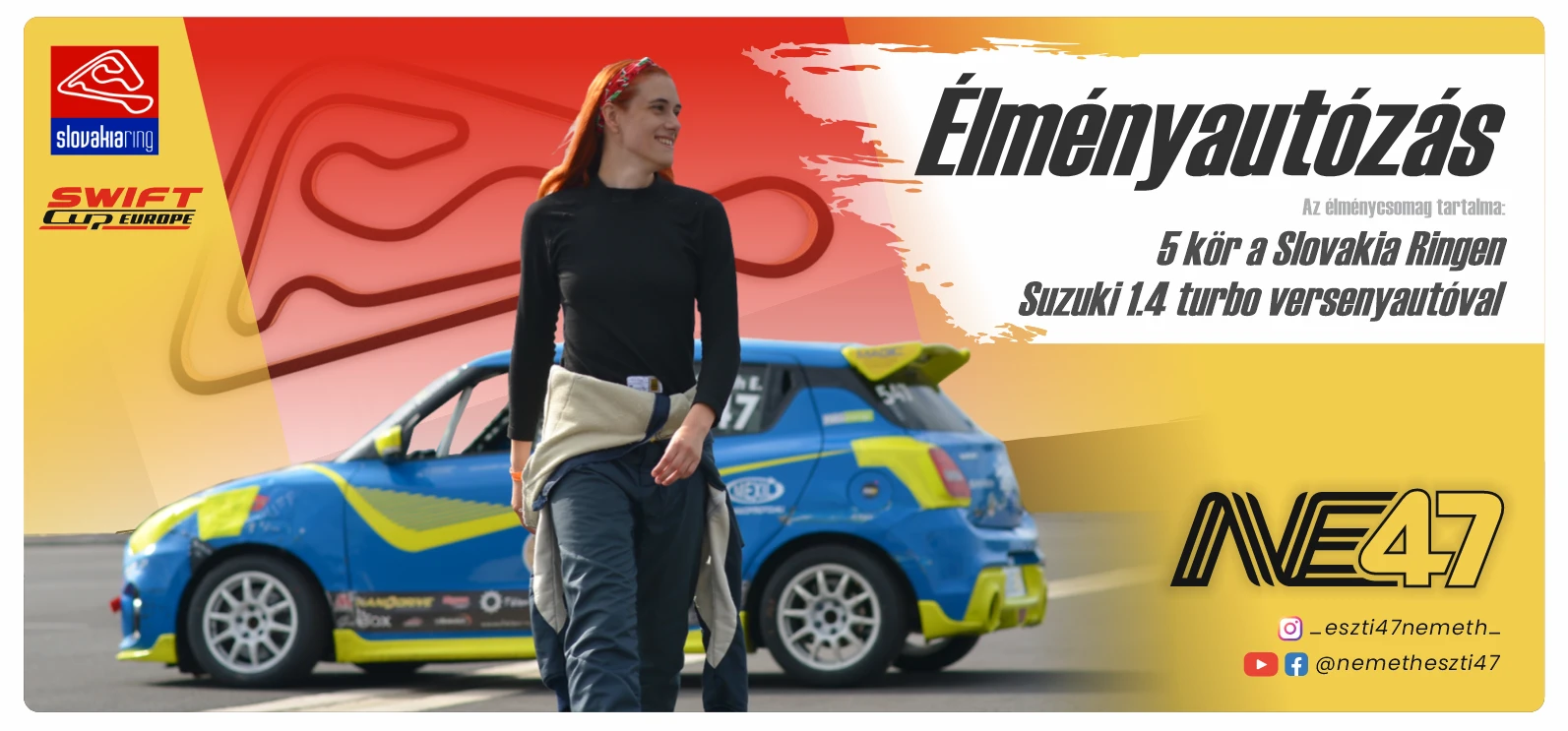 A kupon tartalma: 5 kör a Slovakia Ringen a 2026-os szezonban, utasként, előre egyeztetett időpontban, Németh Eszter által vezetett Suzuki Swift 1,4 T kupás versenyautóval.